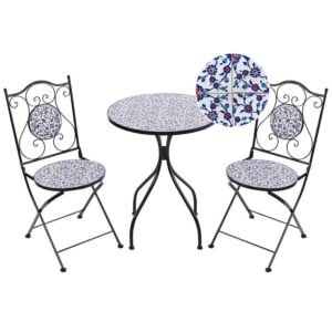Setul prezinta o masa rotunda si doua scaune care pot sustine o greutate de pana la 150 de kg. Este rezistent la zgarieturi si raze UV, fiind prevazut cu pictura manuala.