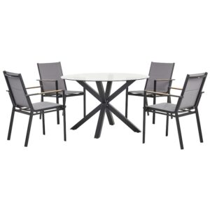Setul este format dintr-o masa dreptunghiulara realizata din aluminiu si sticla securizata si patru scaune din aluminiu. Scaunele pot suporta o greutate de pana la 100 de kg.