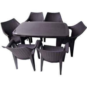 Este un set foarte accesibil ca pret format dintr-o masa dreptunghiulara cu colturi rotunjite si sase scaune. Este usor de intretinut si rezistent la intemperii.