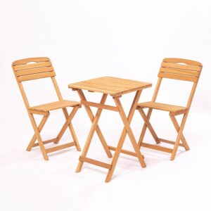 Setul este format din doua scaunesi o masa patrata, ce se pot plia, fiind ideale si pentru spatii mai restranse. Este realizat din lemn masiv de molid si brad si feronerie din metal. Ofera o buna rezistenta la radiatiile UV.